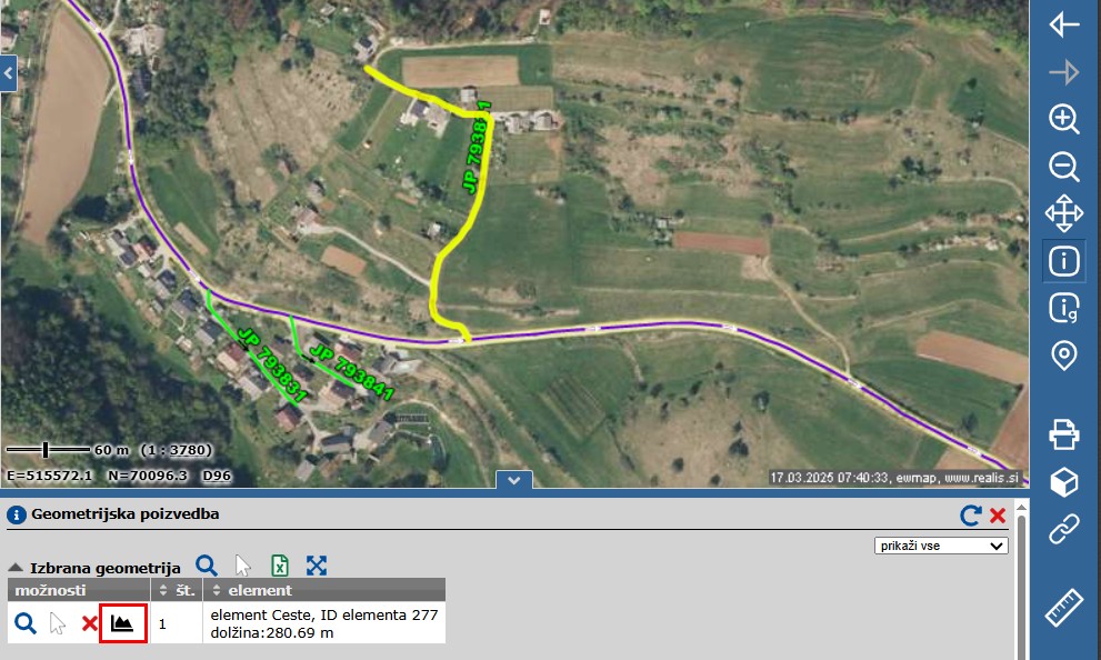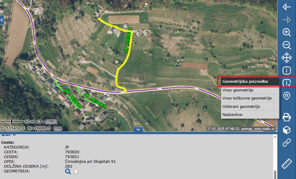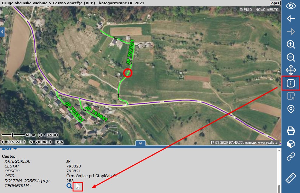 1.    Z lokacijsko poizvedbo kliknemo na element. Pod karto se izpišejo podatki in kliknemo na ikono za izbor geometrije.