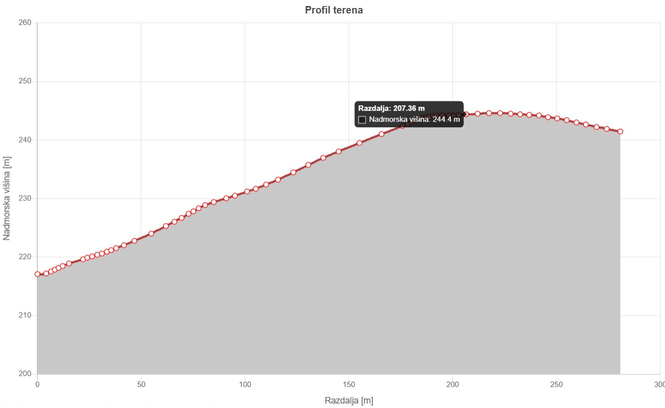4.    V novem oknu se odpre interaktivni profil, ki omogoča prikaz nadmorske višine od začetne točke elementa.
